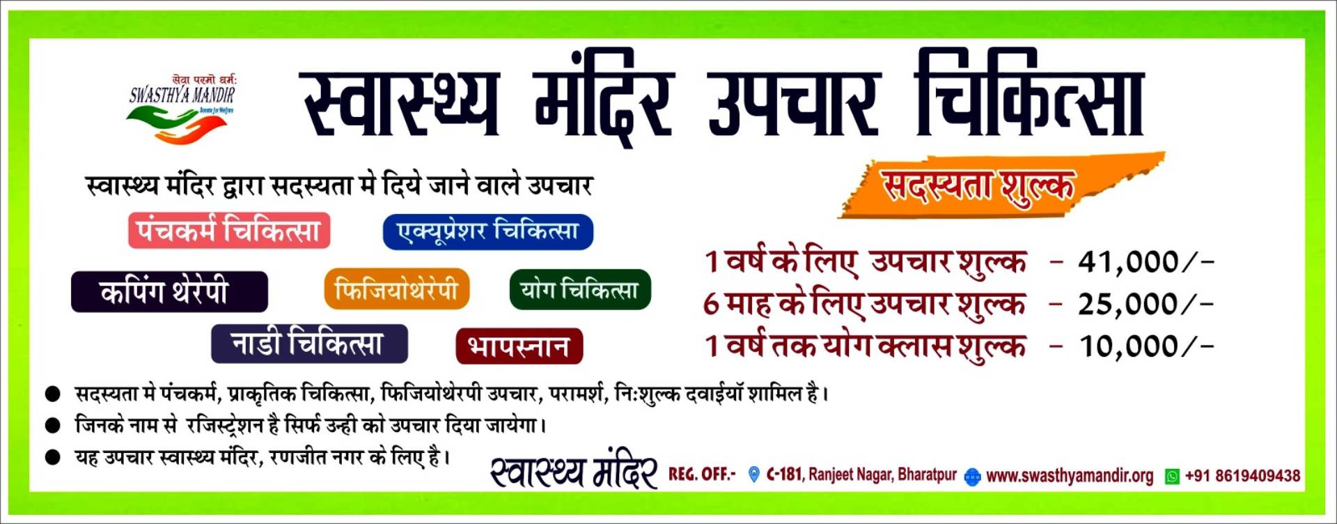 We are glad to introduce yourself that Swasthya Mandir Yog and Prakritik Chikitsa Sansthan is a Non-profit organization located in Bharatpur district of Rajasthan, with its registered office at C-181 Ranjeet Nagar Colony Bharatpur. The organization is committed to work on health through Yoga and Naturopathy, welfare of Children from slum and weaker section families, Day Care old age home, women empowerment and other philanthropy work. Our objective is to create an inclusive society, where people with disabilities, senior citizens, women and Slums children are accepted for safety in health, environment protection, empowerment, protection, care, mainstream economy and social life. The Organization has 12 A/80G, CSR-1and FCRA Registration.